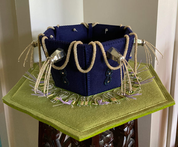 Salt the Tale 18 x 6 x 18 inches Vintage salt and pepper shakers, glass beads, silk-covered gimp, silver gimp and balls, cotton perle thread on wool Available from artist. Price by request.